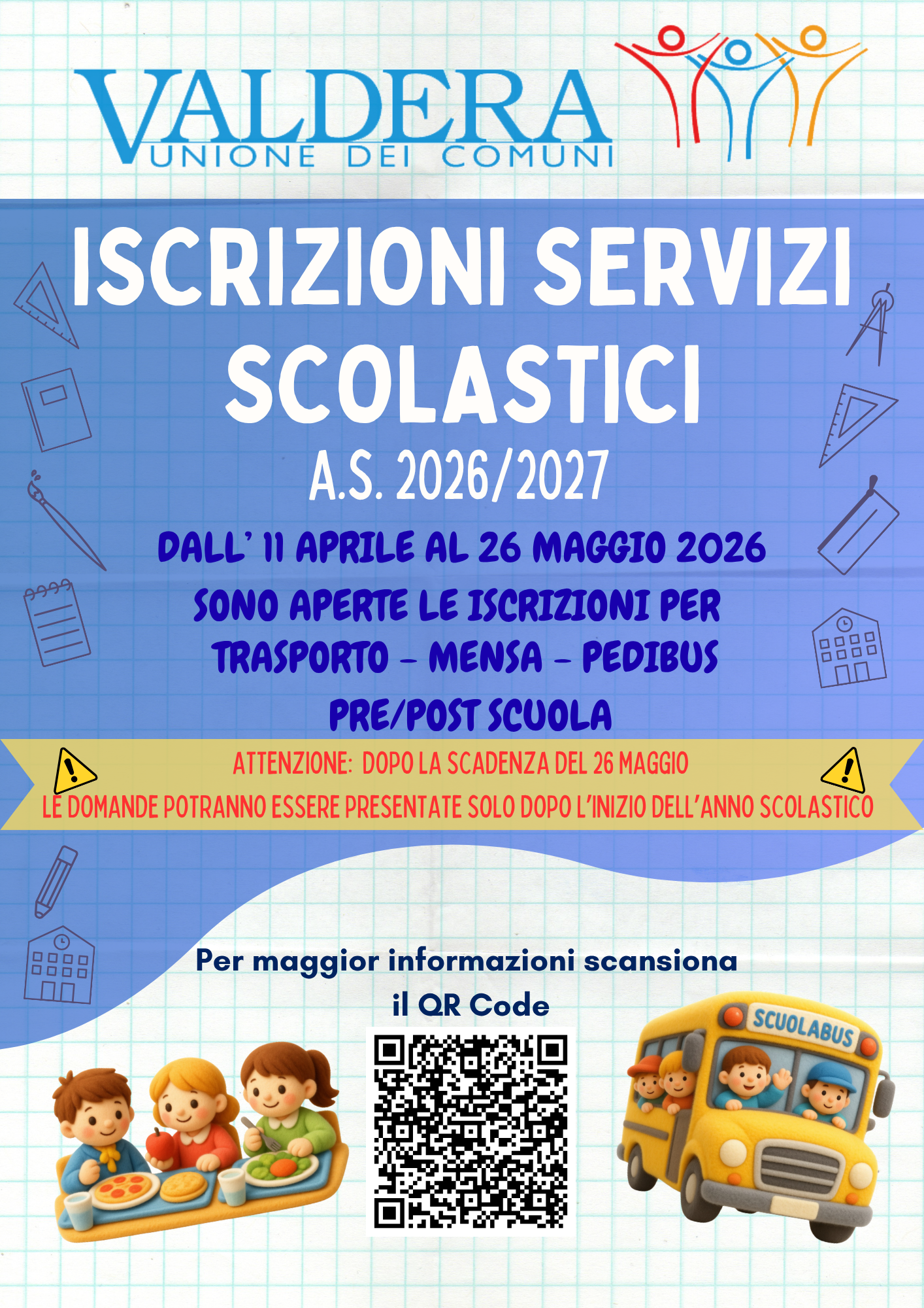 Dal 11/04/2026 e fino al 26/05/2026 sarà aperto il bando per le iscrizioni ai servizi scolastici quali : MENSA - PEDIBUS - SORVEGLIANZA PRE/POST SCUOLA e TRASPORTO per l'a.s. 2026/2027.