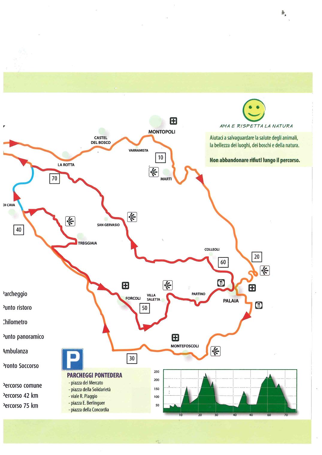 Lungo il tragitto sono allestiti due punti di ristoro, uno al 25° km direzione Montefoscoli euno al 55° nel centro di Palaia.