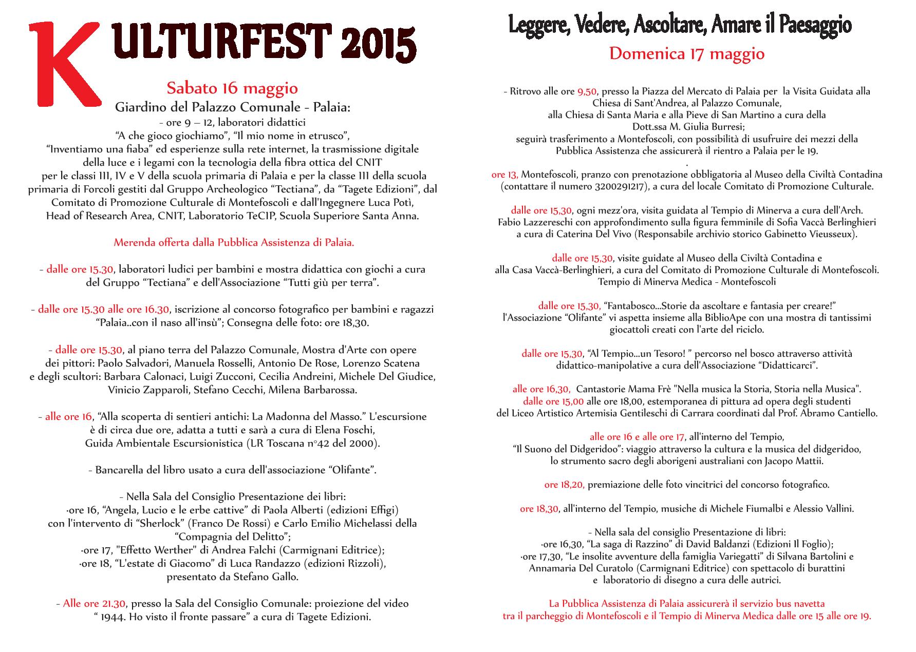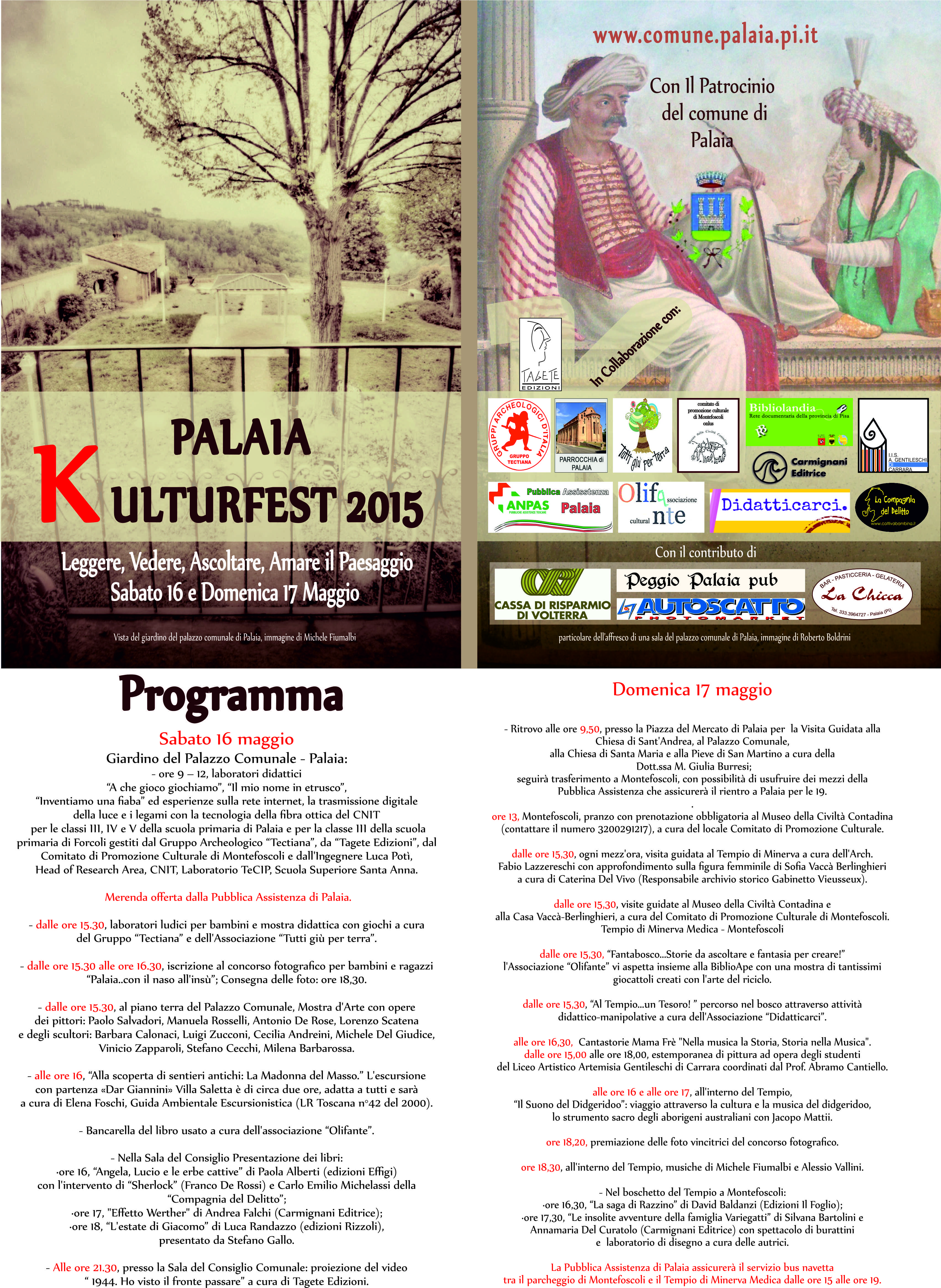 - ore 9 – 12, laboratori didattici (“A che gioco giochiamo”, “il mio nome in etrusco”, “inventiamo una fiaba” ed esperimenti sul funzionamento della fibra ottica) per le classi III, IV e V della scuola primaria di Palaia e per la classe III della scuola primaria di Forcoli gestiti dal Gruppo Archeologico “Tectiana”, dal Gruppo “Tagete” edizioni, dal Comitato di Promozione Culturale di Montefoscoli e dall’Ingegnere Luca Potì del CNIT. Merenda offerta dalla Pubblica Assistenza di Palaia
