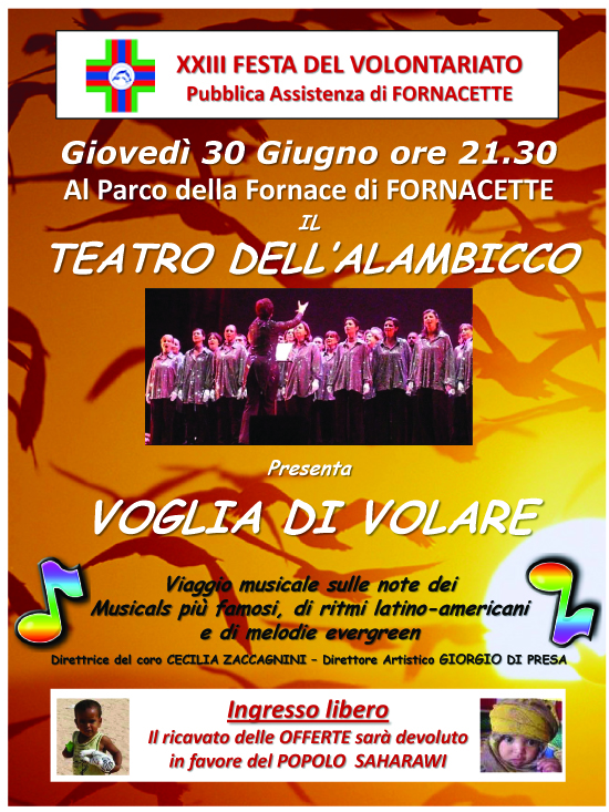Ma grande attenzione va dedicata in particolare ad una serata che, da sempre, rappresenta il fiore all´occhiello della Pubblica Assistenza di Fornacette e cioè quella di giovedì 30 Giugno. Sarà questo, infatti, il classico appuntamento con la solidarietà, un appuntamento nel quale una consistente parte del ricavato verrà devoluta all´associazione Saheb di Calcinaia, affinché ne disponga per i suoi fini umanitari a sostegno del Popolo Saharawi. Quindi rivolgiamo a tutti, forte, l´appello a sostenere con la propria presenza questa nobile iniziativa, partecipando numerosi sia alla cena sociale, che allo spettacolo d´intrattenimento su cui la serata stessa è imperniata.