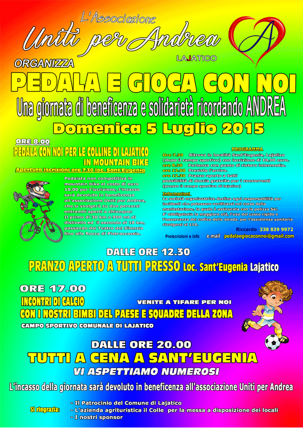L'ASSOCIAZIONE UNITI PER ANDREA, CON IL PATROCINIO DEGLI SPONSOR, DEL COMUNE DI LAJATICO E DELL'AZIENDA AGRITURISTICA IL COLLE, ORGANIZZA UNA GIORNATA DI BENEFICENZA E SOLIDARIETA' RICORDANDO ANDREA, DOMENICA 5 LUGLIO 2015 DALLE ORE 8.00 ALLE ORE 20.00.