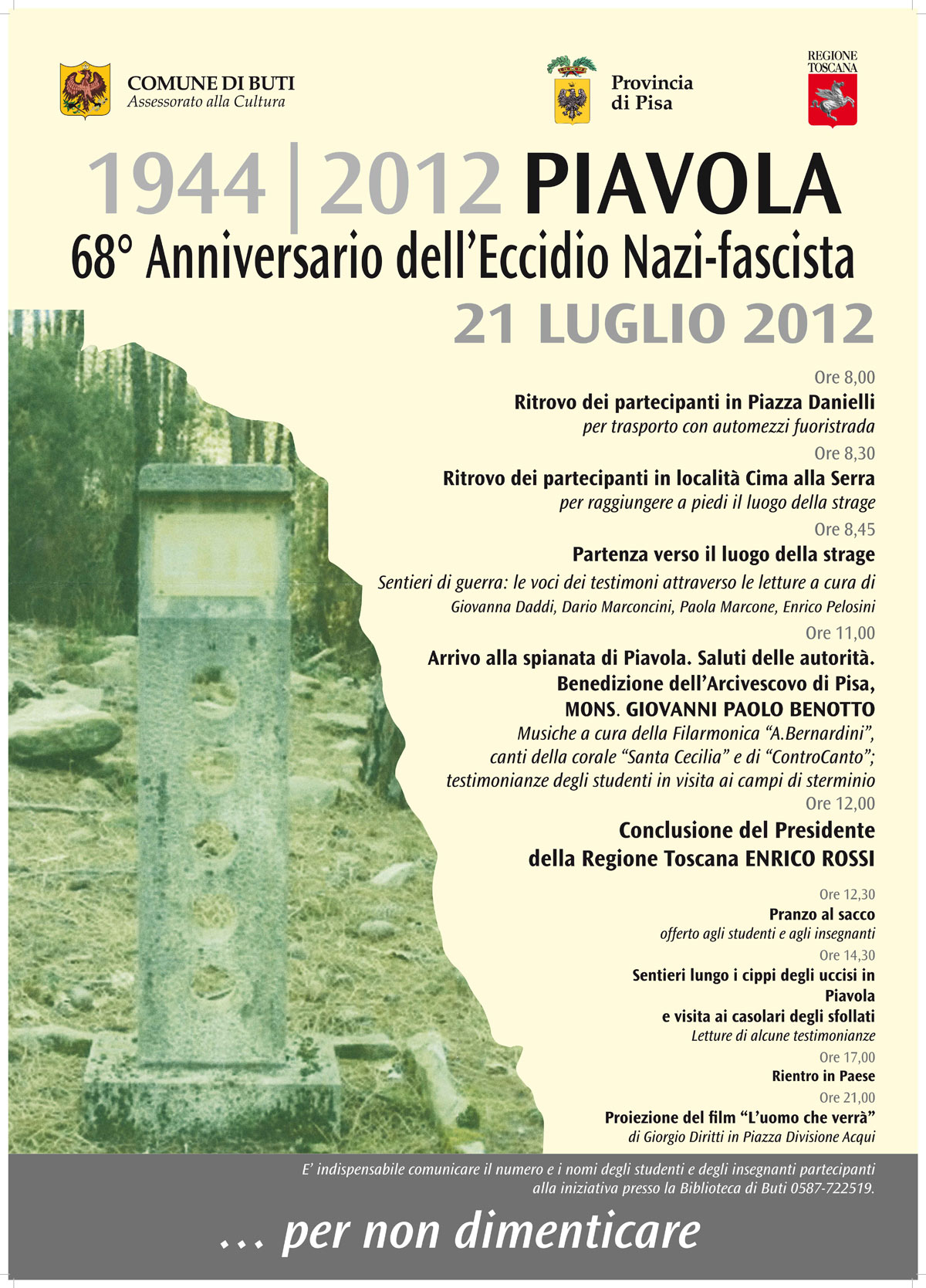 Ore 11,00 ___ Arrivo alla spianata di Piavola. Benedizione dell’Arcivescovo di Pisa, MONS. GIOVANNI PAOLO BENOTTO. Saluti delle autorità. Musiche a cura della Filarmonica “A.Bernardini”, canti della corale “Santa Cecilia” e di "ControCanto", testimonianze degli studenti in visita ai campi di sterminio