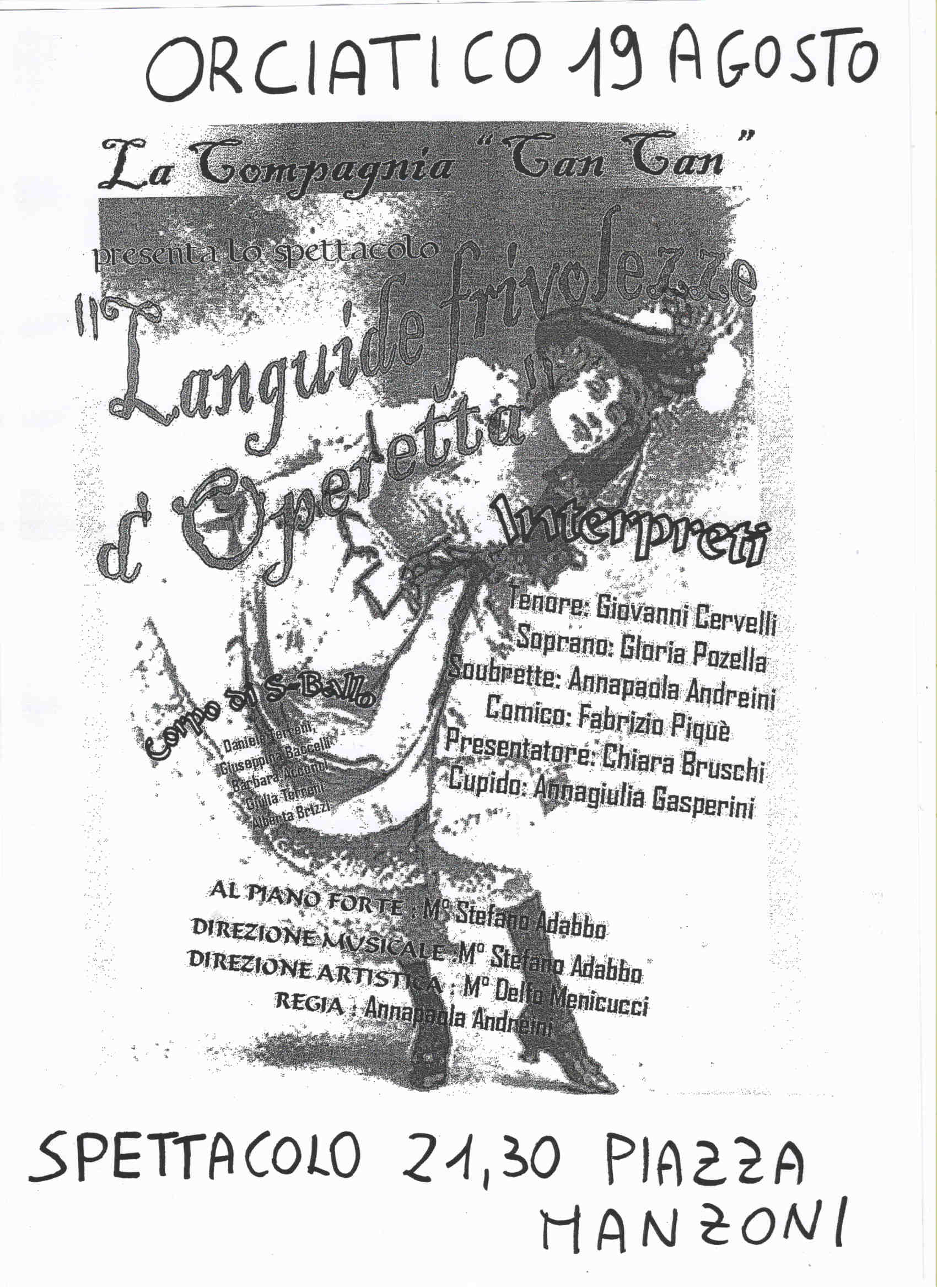 AD ORCIATICO, DOMENICA 19 AGOSTO 2012 ALLE ORE 21.30 LA COMPAGNIA " TAN TAN " PRESENTERA' LO SPETTACOLO "LANGUIDE FRIVOLEZZE D'OPERETTA" NELLA PIAZZA MANZONI.