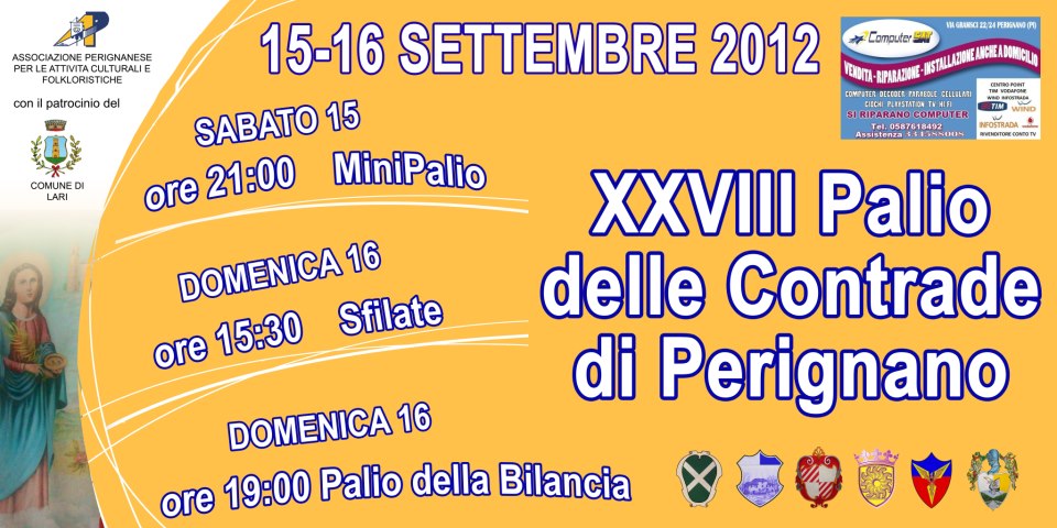 Si svolgerà sabato 15 e domenica 16 settembre la XXVIII° edizione del Palio delle Contrade di Perignano - tradizionale manifestazione organizzata Associazione Perignanese per le Attività Culturali e Folkloristiche con il patrocinio del Comune di Lari -