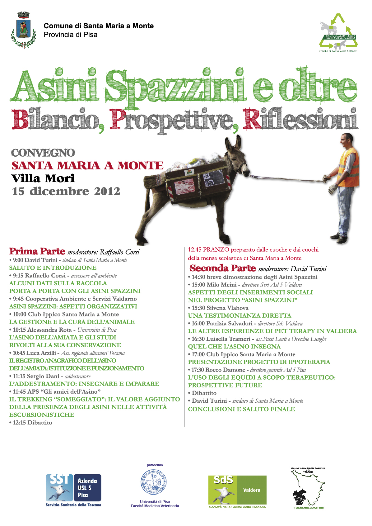 Il convegno, organizzato dal Comune con il patrocinio della Facoltà di medicina veterinaria dell´Università di Pisa e in collaborazione con Asl 5 Pisa, Società della Salute Valdera e Fit (Filiera Ippica Toscana), coprirà tutta la giornata di sabato 15 dicembre e sarà diviso in due parti distinte: nella prima, che si svilupperà durante la mattinata e sarà moderata dall´assessore all´ambiente Raffaello Corsi, i vari interventi analizzeranno e illusteranno gli aspetti relativi alla raccolta porta a porta con gli Asini Spazzini, alla cura dell´animale, all´addestramento, alla salvaguardia della razza amiatina. Lo stesso Raffaello Corsi poi illusterà i dati relativi alla raccolta differenziata del Comune di Santa Maria a Monte e i risultati raggiunti, in questo ambito, dagli Asini spazzini. La seconda parte del convegno, che invece si svolgerà tutta nel pomeriggio, sarà incentrata su uno degli aspetti maggiormente signifiativi del progetto e cioè la sua valenza nel campo del recupero sociale di soggetti svantaggiati. Fin dal luglio 2009, infatti, sono stati numerosi i soggetti, provenienti dal Sert o da altre situazioni di disagio, ad avere una possibilità di reinserimento grazie agli "Asini Spazzini". In questo senso sarà molto significativa la testimonianza diretta di Silvena Vlahova, compagnia di Gianfranco Mei, l´operatore ecologico deceduto in seguito ad un incidente stradale proprio mentre lavorava con gli Asini Spazzini. Tra i vari interventi che si susseguiranno in questa seconda parte, da segnalare quello del direttore del Sert Valdera Milo Meini e del direttore generale dell´Asl 5 Rocco Damone.