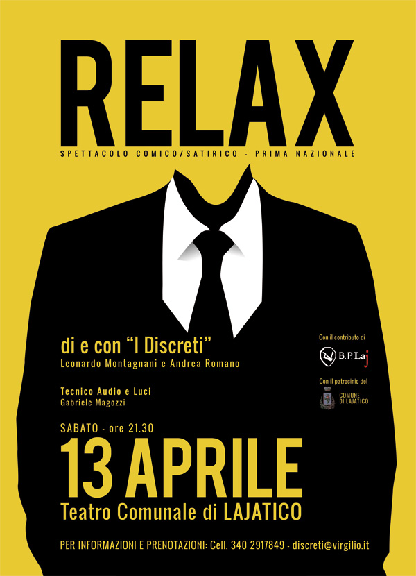 Sabato 13 Aprile 2013 alle ore 21.30 c/o il Teatro Comunale di Lajatico andrà in scena RELAX di e con " I DISCRETI" di Leonardo Montagnani e Andrea Romano, spettacolo comico/satirico - prima nazionale.