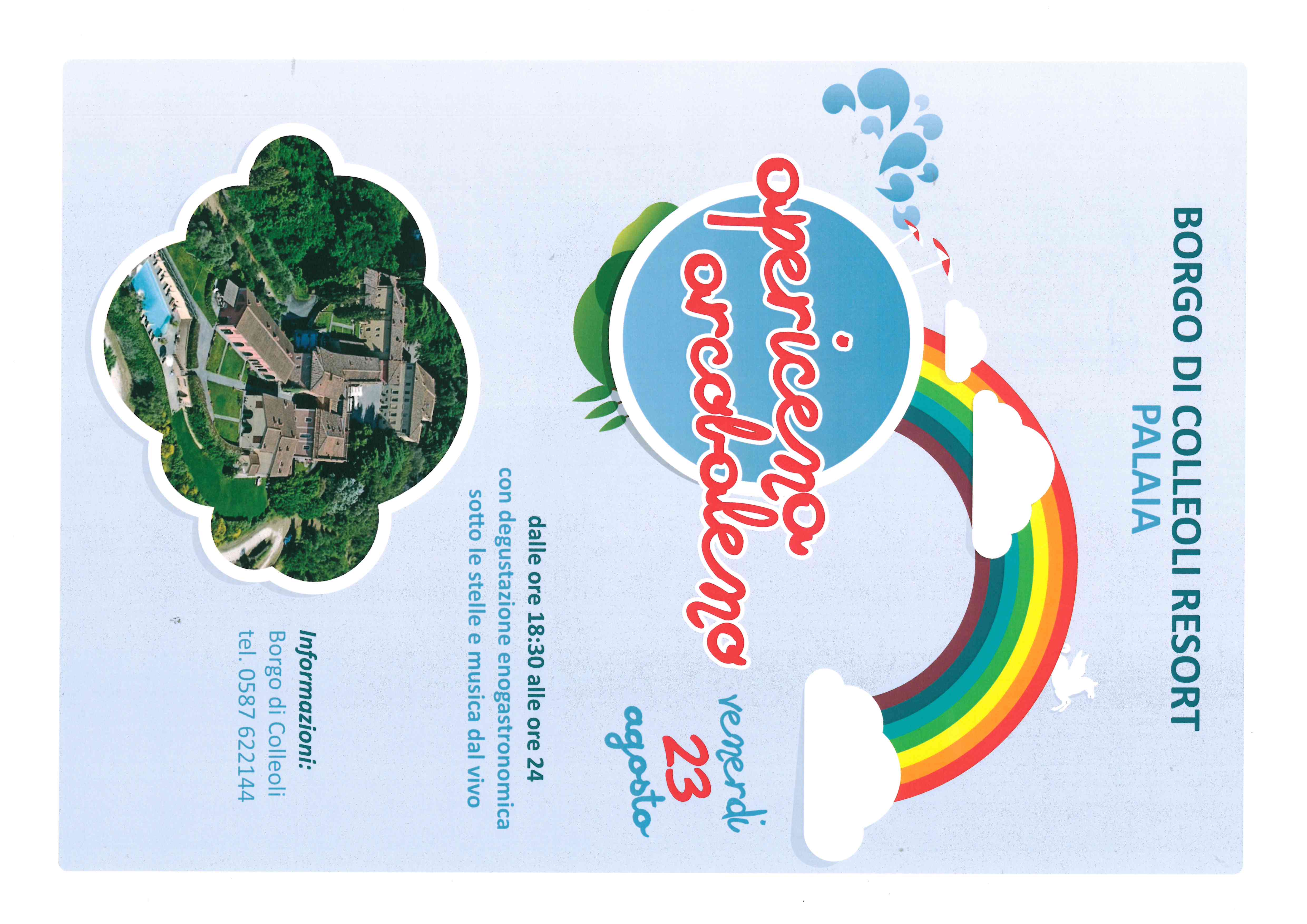 VENERDI 23 AGOSTO APERICENA ARCOBALENO PRESSO IL BORGO DI COLLEOLI RESORT DALLE ORE 18.300 ALLE ORE 24.00 CON DEGUSTAZIONE ENOGASTRONOMICA CHE PREVEDE: UN PRIMO FREDDO,UN TAGLIERE DI AFFETTATI MISTI E DUE DEGUSTAZIONI . IL TUTTO SOTTO LE STELLE E CON MUSICA DAL VIVO.