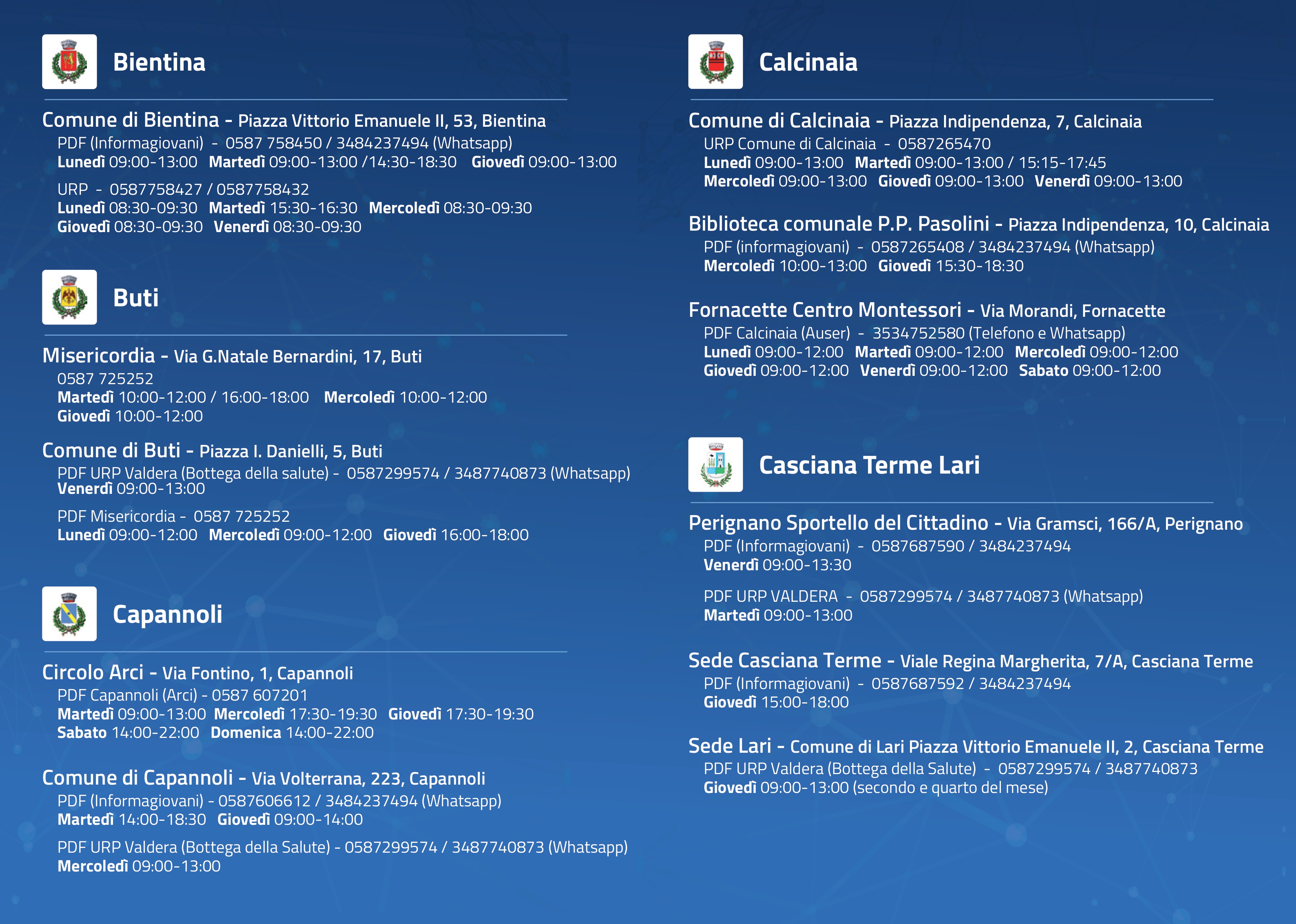 Per prenotare un appuntamento presso i PDF URP VALDERA (Bottega della Salute) e il PDF Informagiovani, è possibile utilizzare le seguenti pagine dedicate: